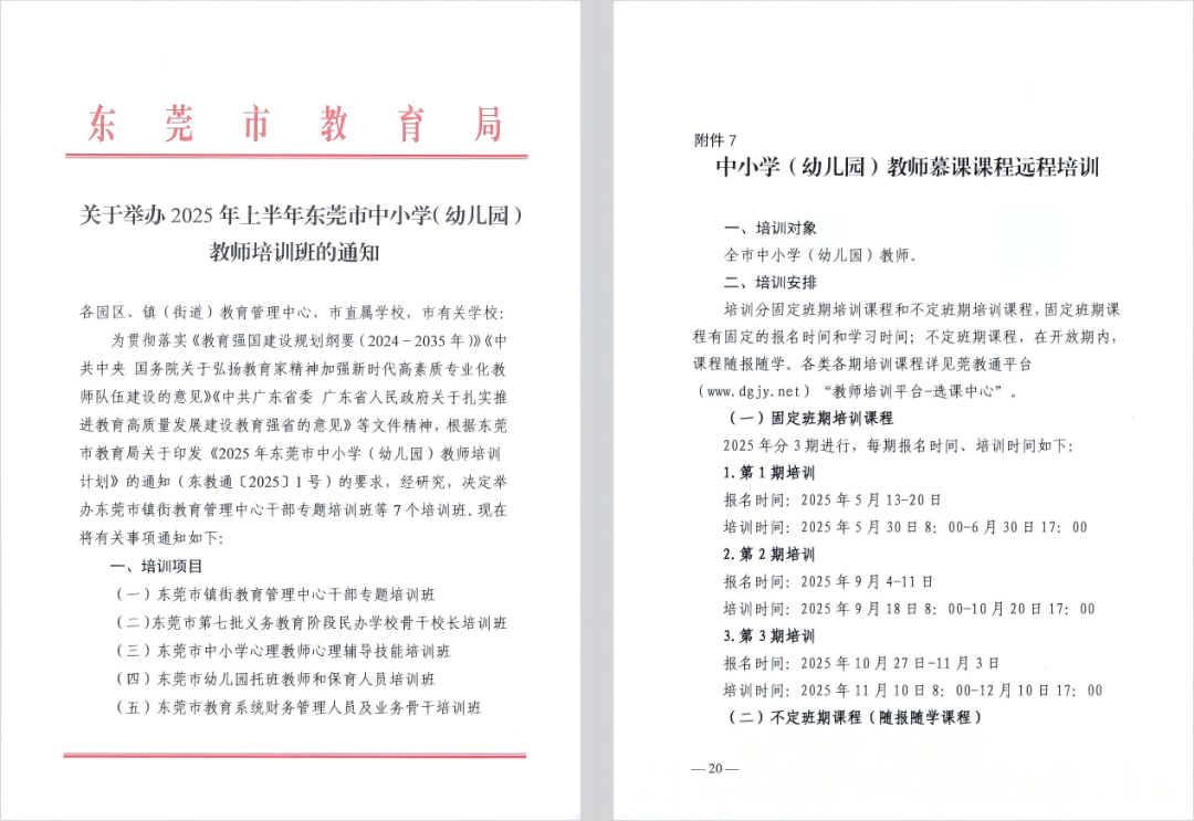 为贯彻落实《教育强国建设规划纲要(2024-2035年)》《中共中央 国务院关于弘扬教育家精神加强新时代高素质专业化教师队伍建设的意见》《中共广东省委 广东省人民政府关于扎实推进教育高质量发展建设教育强省的意见》等文件精神,根据东莞市教育局关于印发《2025年东莞市中小学(幼儿园)教师培训计划》的通知(东教通〔2025〕1号)要求,“2025年东莞市中小学(幼儿园)教师慕课课程远程培训(第1期)”于2025年5月30日—6月30日开展。