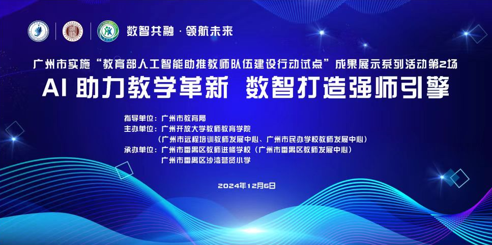 12月6日下午,广州市实施“教育部人工智能助推教师队伍建设行动试点”成果展示系列第2场——AI助力教学革新 数智打造强师引擎,在广州市番禺区荟贤小学阶梯室及学研中心顺利举行。